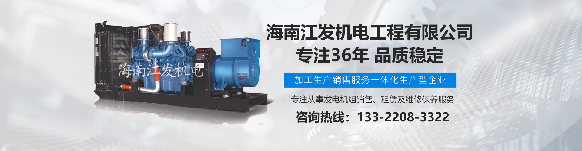 海南江發機電工程有限公司是海南經營進口、國產柴油發電機組、是海南較早、較大的銷售、租賃服務及維修保養專業機電公司。從1985年開始,公司勵精圖治、銳意進取、不斷創新,不僅在海南機電行業領域中具有先進技術、完美管理、誠信服務,高超的產品質量和性能,而且還有合理的產品性能價格比,令客戶滿意以及完善的支持保障。 在客戶心目中,江發公司不僅具有最好的企業信譽,還是客戶最信賴的誠信單位,而且會帶給客戶永遠的光明和豐厚回報。